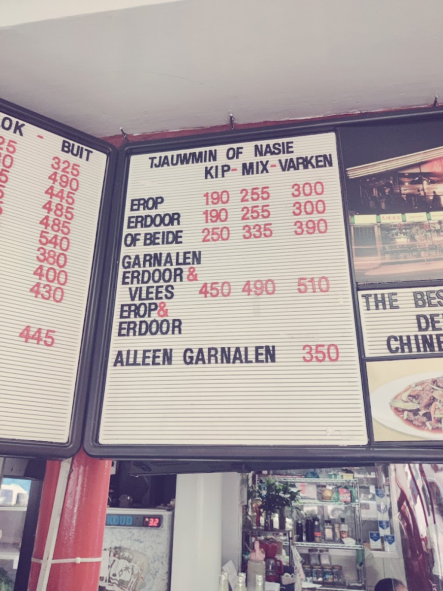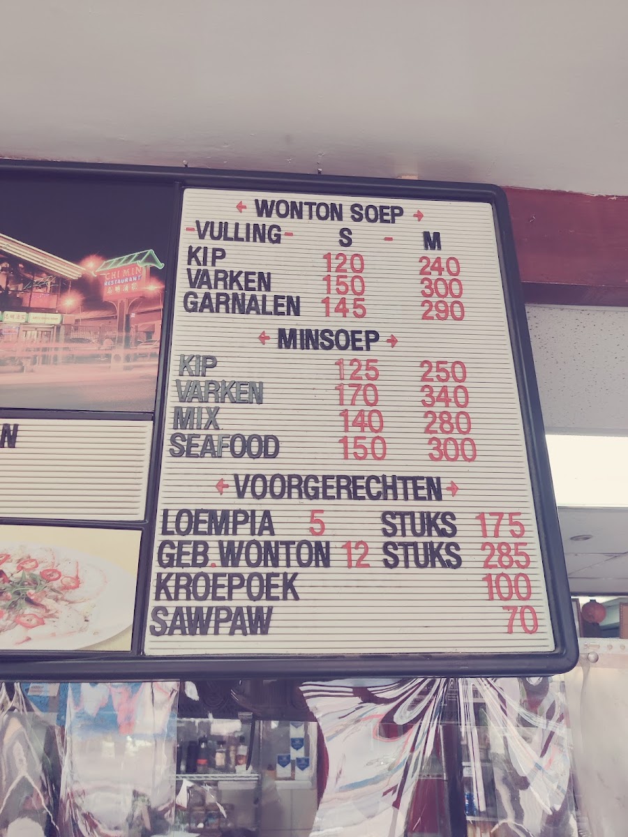 Highlights include hearty options like roast chicken and beef, alongside flavorful noodles such as Tjauwmin Moksi Met Varkens Vlees En Kip. Soups like wonton and Shop Soi provide a warm start, while seafood lovers can explore spicy dishes featuring inkfish, prawns, and crab. For a lighter or vegetarian choice, offerings like Vegtarische Mi Hoen balance well within the menu’s diverse range.